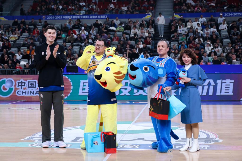 新疆男篮为两位吉祥物扮演者送上礼物。(新疆广汇俱乐部供图)