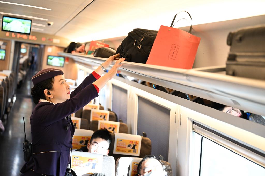 1月15日,张洁在G1605次列车上整理旅客行李。新华社记者 季春鹏 摄