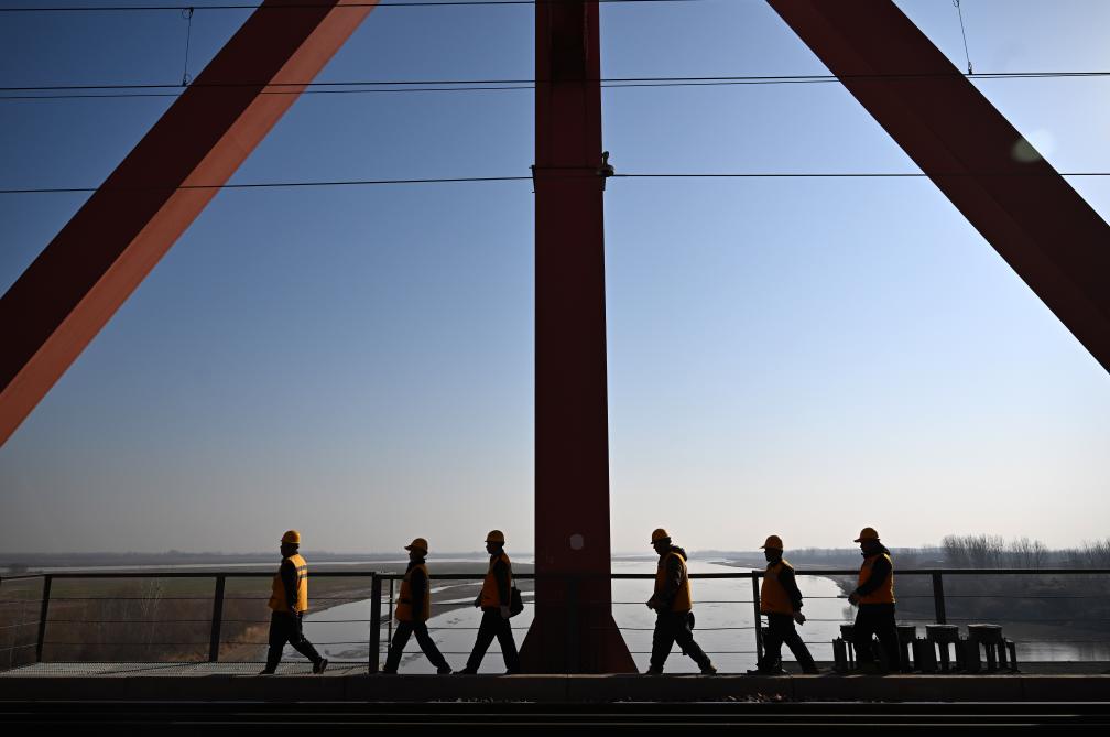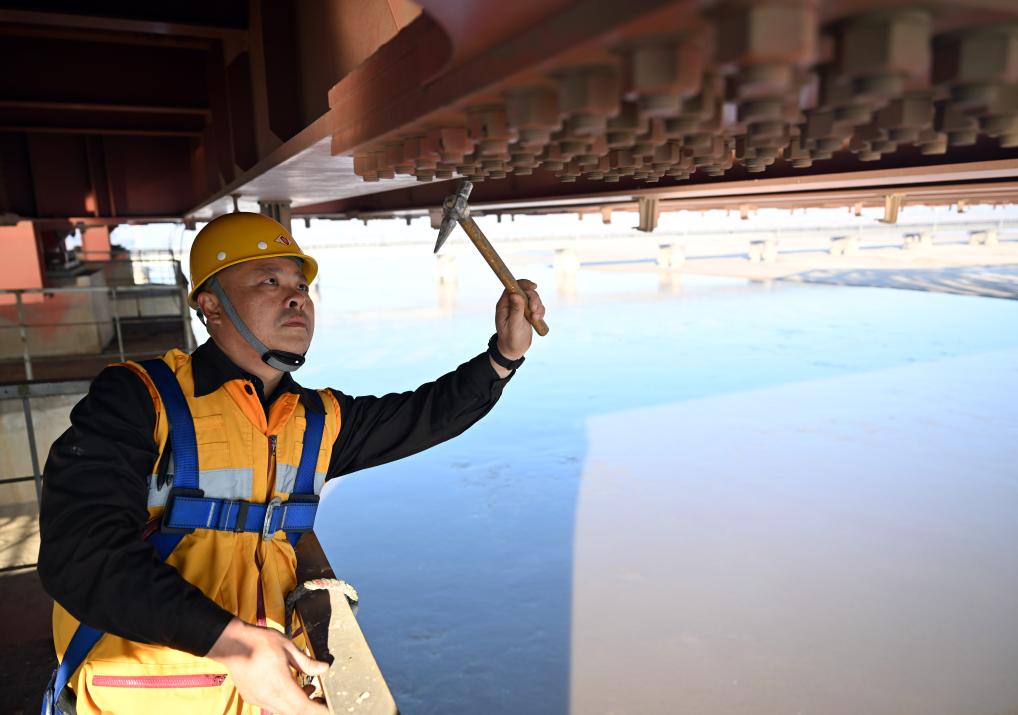 1月17日,桥梁工登上郑焦城际铁路黄河大桥,检查养护主桥梁体和桥墩设备。新华社记者 李嘉南 摄