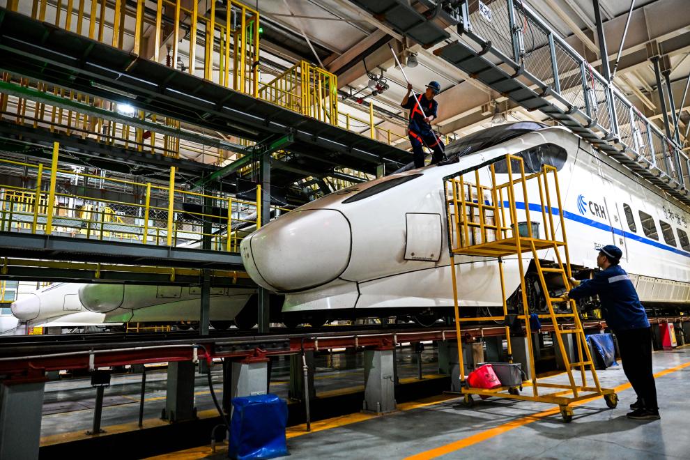 1月17日,工作人员对动车组车体表面进行清洁。新华社记者 连振 摄