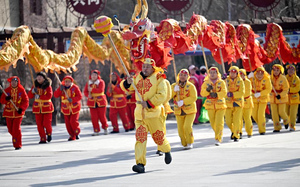 1月18日,银川市西夏区芦花洲社区居民在排练社火。新华社记者 王鹏 摄