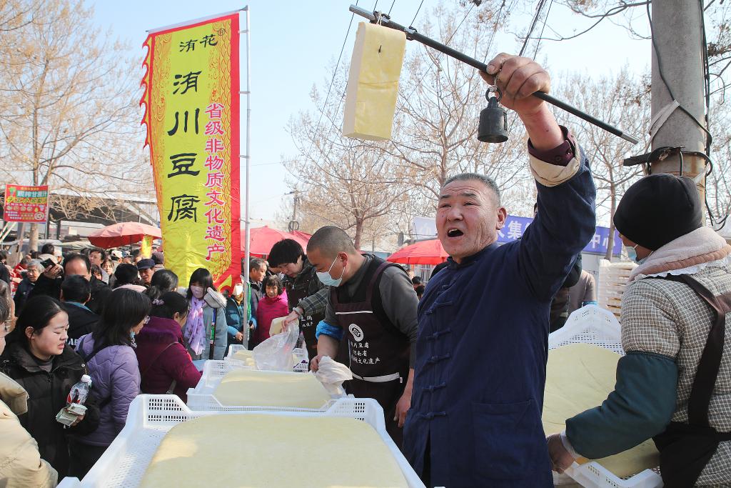 1月18日,一商贩在河南省郑州航空港实验区洧川大集上推销当地非遗豆腐。新华社发(李新义摄)