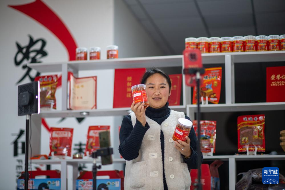 云南省曲靖市会泽县乐业镇村民黄国美在家门口的产业园区直播带货(1月22日摄)。