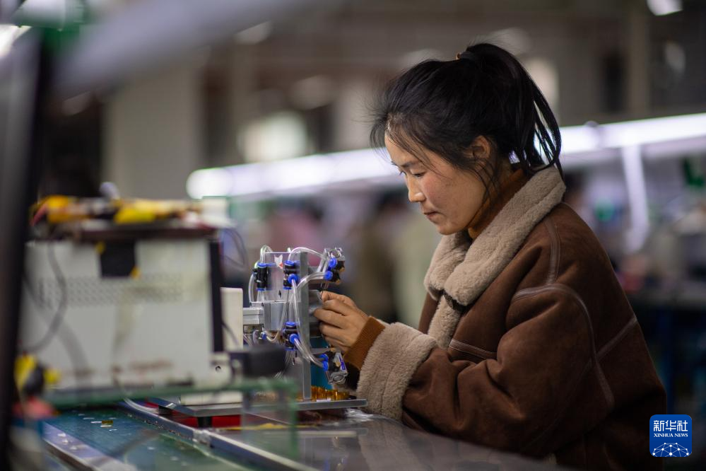 云南省曲靖市会泽县钟屏街道居民杨金芳在家门口的电子厂上班(1月21日摄)。
