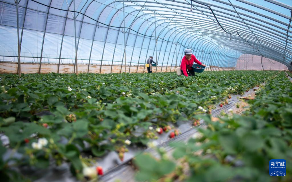 云南省曲靖市会泽县迤车镇迤北村村民在村里的草莓种植基地采摘草莓(1月22日摄)。