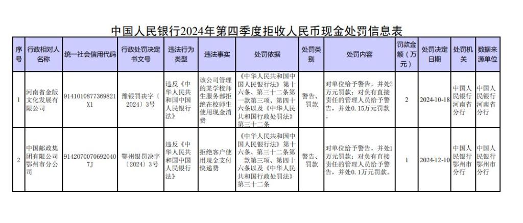 中国人民银行发布的处罚信息显示,此次被曝光的单位是河南省金版文化发展有限公司、中国邮政集团有限公司鄂州市分公司。前者是因为其管理的某学校师生服务部拒绝在校师生使用现金消费被处罚,后者是因为拒绝客户使用现金支付快递费被处罚。两家单位分别被罚款2万元、1万元。