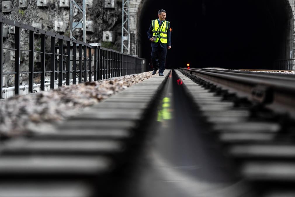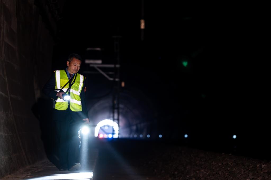 诸葛城站车站值班员李燕林在隧道里进行清扫道岔作业(1月21日摄)。