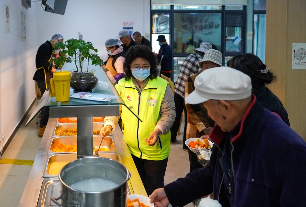 社区志愿者在“三块三”爱心食堂帮助前来用餐的老年人打菜。新华社记者 陈欣波 摄
