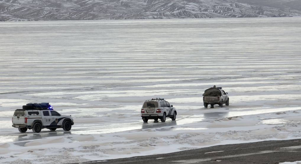 冬季巡山中,巡山队车辆在冰冻的湖面前进(2024年2月12日摄)。新华社记者 杜笑微 摄