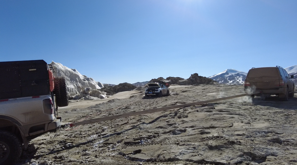 最终,巡山队员下车用拖车绳将被困车辆与其他车辆相连,大油门拖拽,才将被困车辆拖出来。