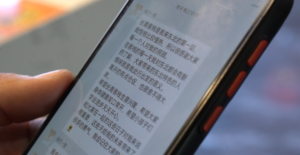 在南沟村经营民宿的贾长青给记者展示了微信里的一段文字:“长青客栈是我来东北的第一站。在客栈的每一天,我对东北都会有新的了解。大家带来的东北特色的人情味就是我此行出发的意义……这些天给我的未来带来了很多的勇气,我会记住大家的。”