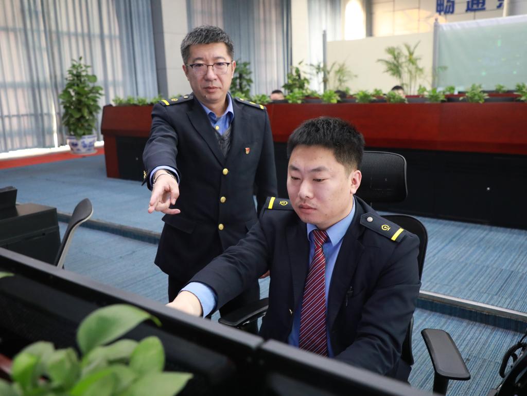 刘淼(右)在收集当日列车到发情况信息。(孙伟 摄)