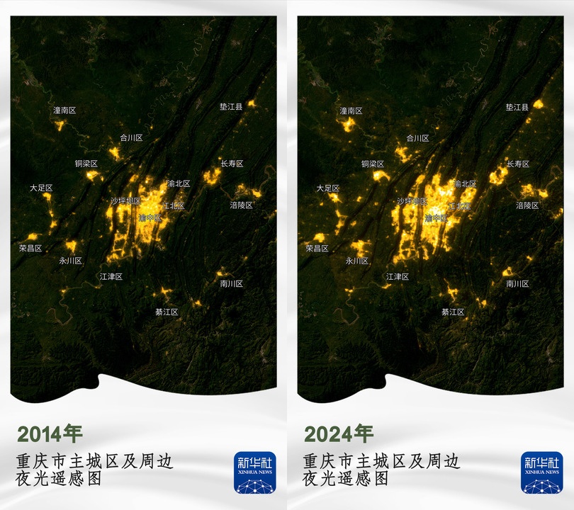 卫星提取到的人类夜间生产生活的灯光影像数据又称为“夜光指数”,能有效反映地区生产总值的变化。从山城到“不夜城”,背后是重庆经济发展水平的跃升。十年来,重庆夜光指数越来越高。