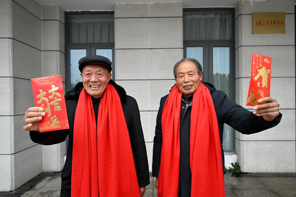 1月25日,在凤阳县小岗村,“大包干”带头人严金昌(左)和严宏昌展示自家领取的分红红包。新华社记者 黄博涵 摄