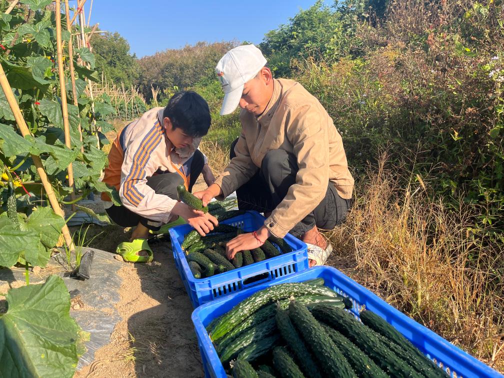 那受村返乡青年在青瓜新品种示范种植基地采收青瓜。新华社记者罗江 摄