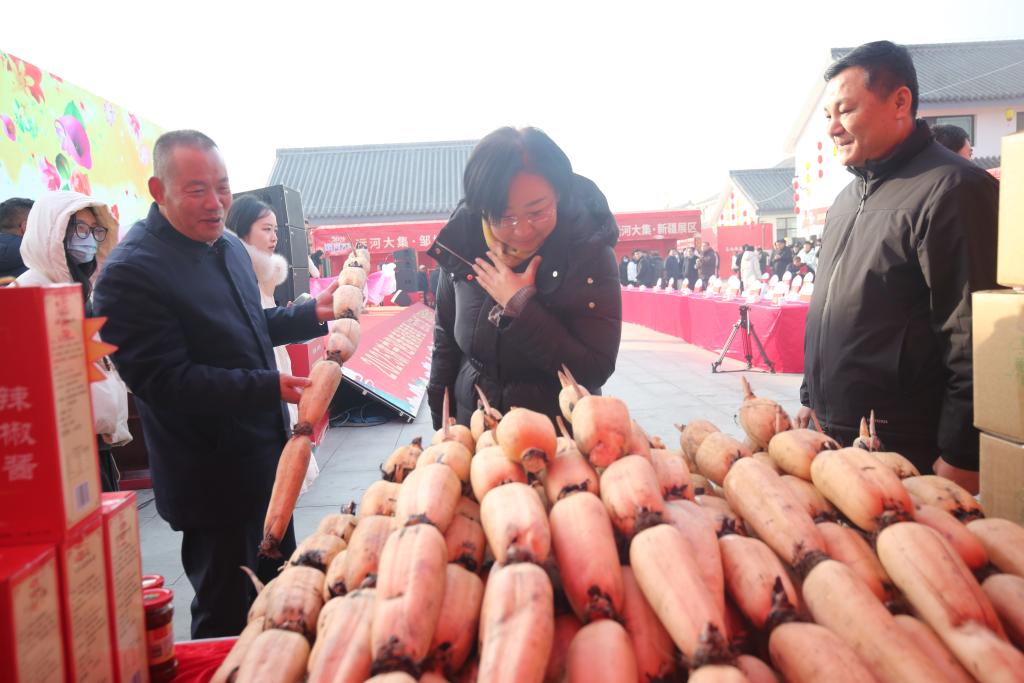 邹城市太平镇的“运河大集”,莲藕等带有大运河元素的农产品颇受欢迎。(受访者供图)