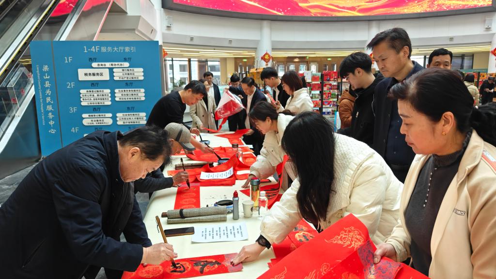 梁山县为民服务中心,500余种名优产品集中展示,当地书法家还为办事群众写“福”迎春。新华社记者萧海川 摄