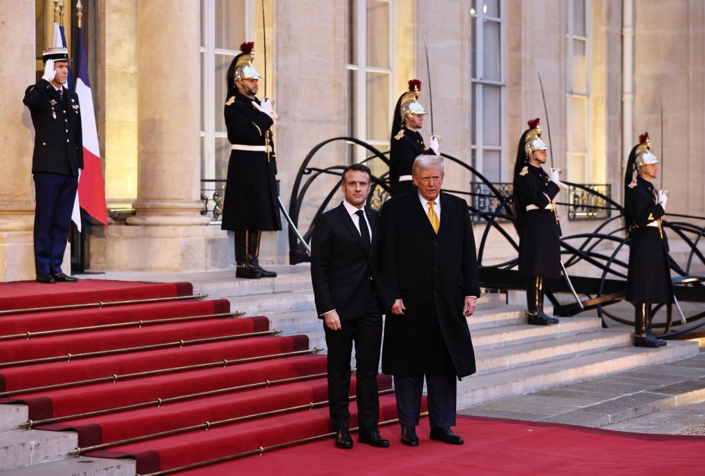 2024年12月7日,法国总统马克龙(前左)在巴黎总统府爱丽舍宫欢迎特朗普(前右)。新华社记者 高静 摄
