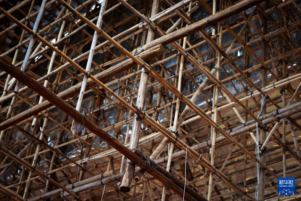被当地人称作“篾仔”的篾条不能不提。陈煜光说,香港戏棚搭建技艺传承了几代人,唯一变化的就是用来绑定、加固竹子和杉木的竹篾,换成了现代的胶篾,更有韧性、更耐用,加强了戏棚的安全性。