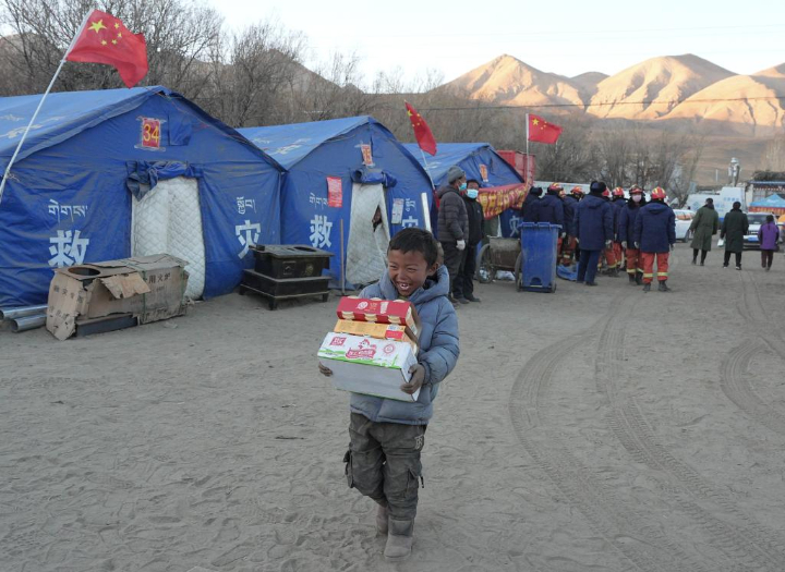 1月9日,在定日县长所乡森嘎村安置点,一名孩子领到饮料和食物后露出笑容。新华社记者 晋美多吉 摄