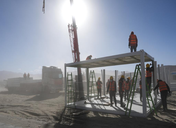 1月9日,工作人员顶着风沙在定日县长所乡森嘎村搭建板房。新华社记者 晋美多吉 摄
