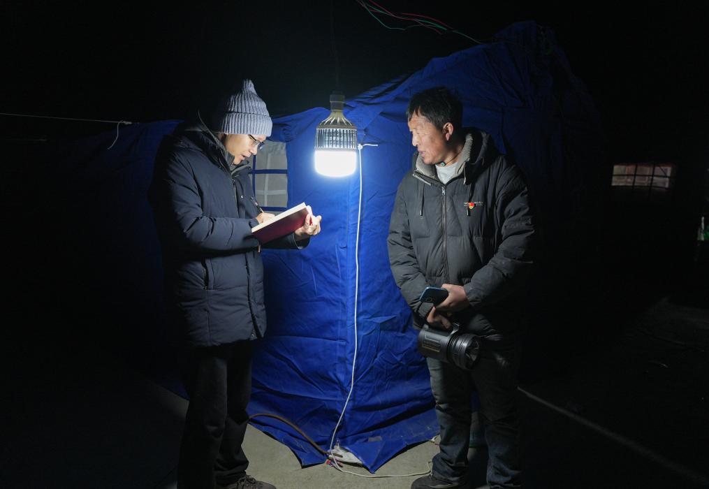 1月8日凌晨3点,新华社记者储国强在受灾最严重的古荣村采访受灾群众。新华社记者 晋美多吉 摄