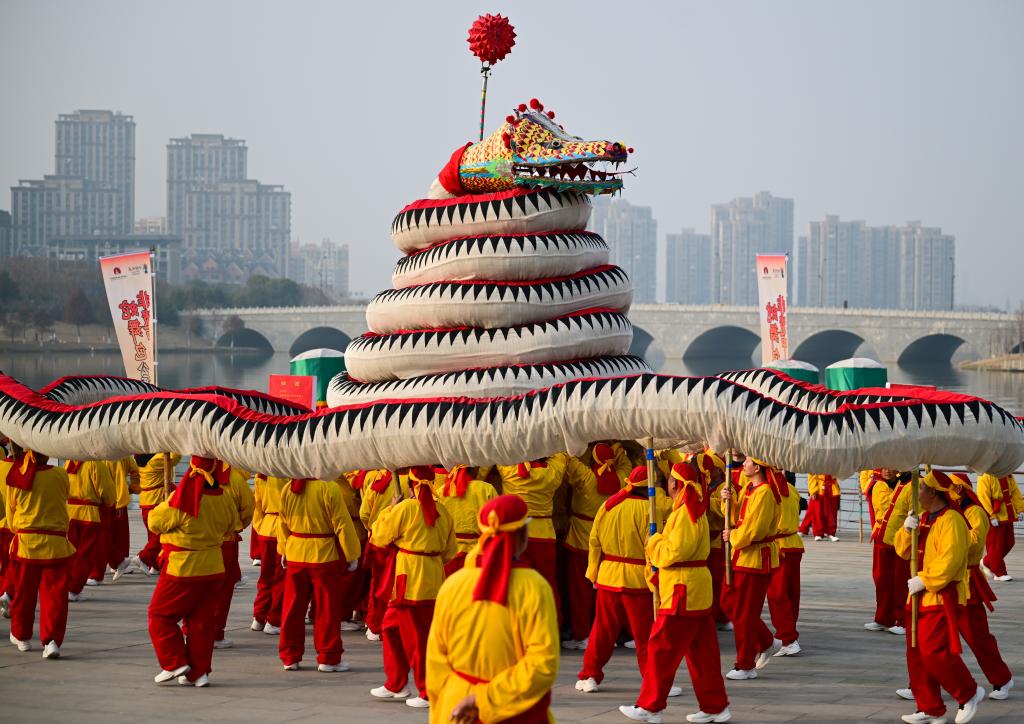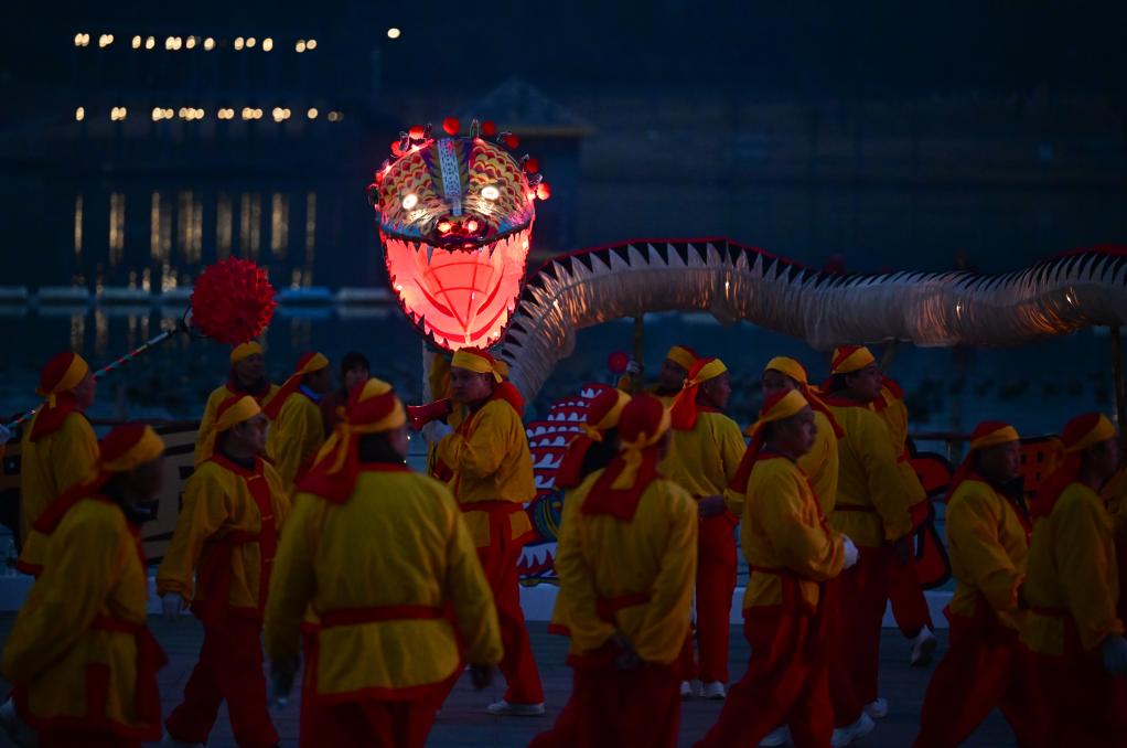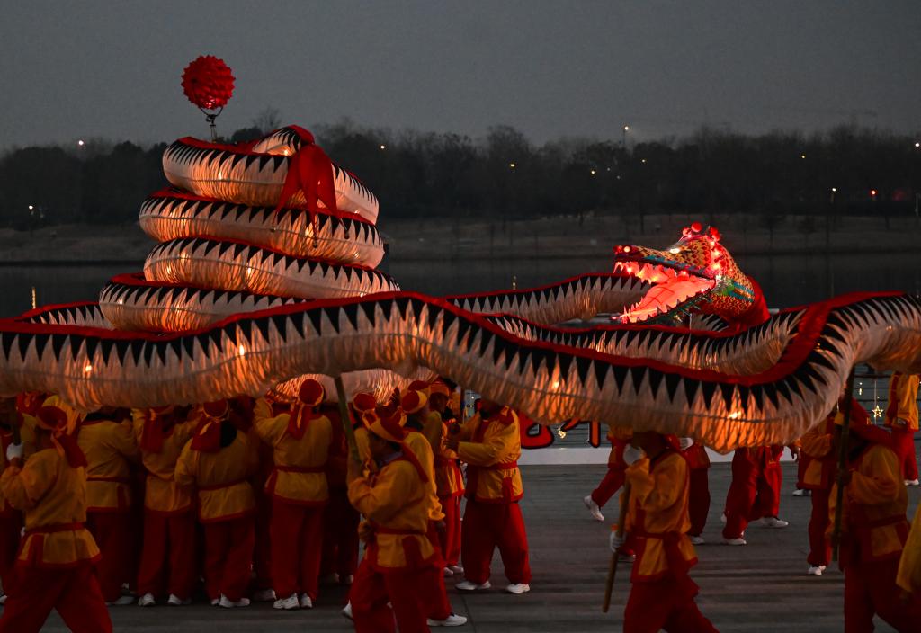 “出灯啦!”随着一声号令,鼓乐齐鸣,长达128米的“肥东洋蛇灯”起身游走,光彩灵动。蛇年春节临近,安徽省合肥市肥东县的和睦湖畔,通体流光的洋蛇灯在夜色中时而昂首,似腾空而去,时而垂头,如蓄势待发。