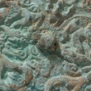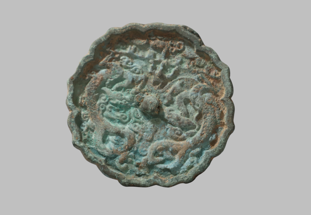 阿尔寨石窟遗址6号建筑基址出土的铜镜。新华社发