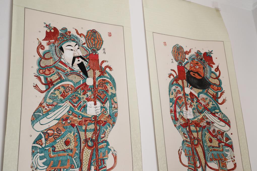 1月18日,邰立平工作室内展示的《方相》《方弼》门神年画作品。新华社记者 林胜概 摄