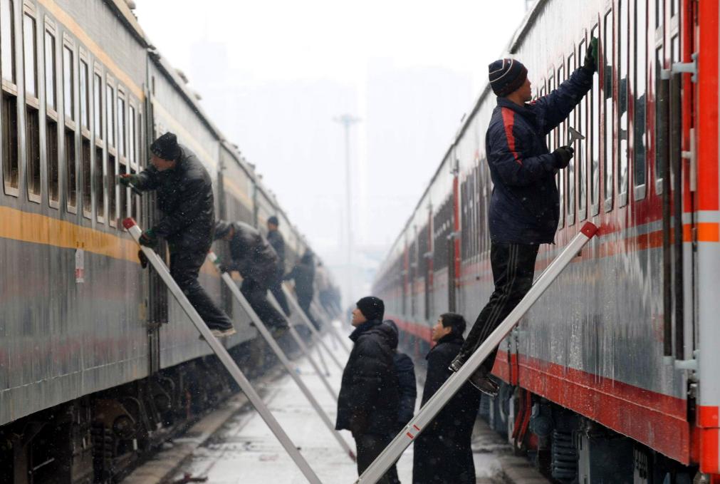 2012年1月7日,北京客运段保洁车间人员在擦拭新增春运临客列车的玻璃。