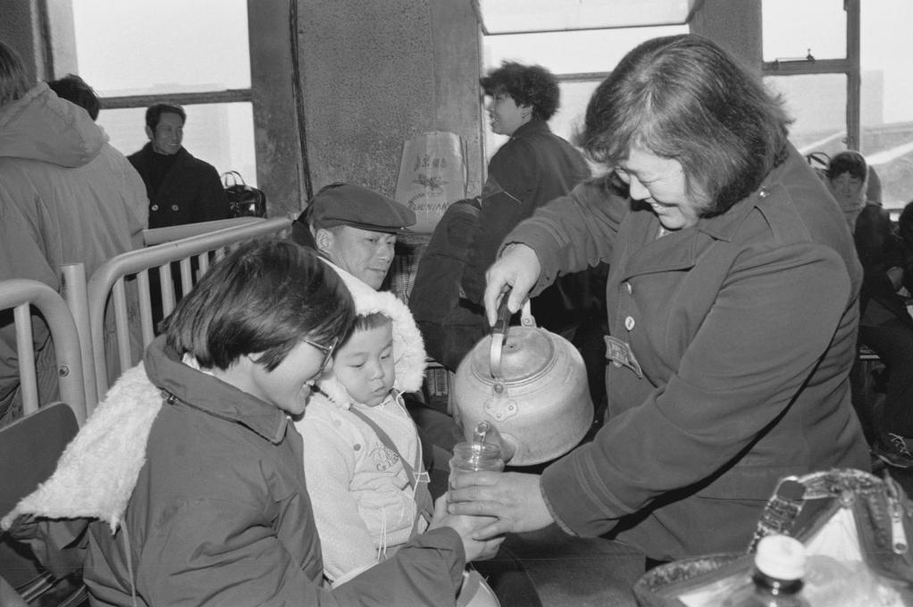 1993年1月14日,在北京火车站候车区,车站服务员韩秀琳(右)在为旅客送水。