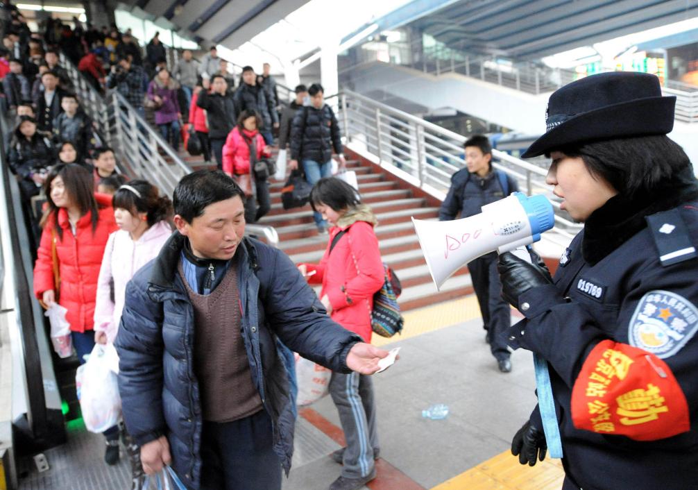2010年2月6日,一名女铁警在维持旅客上车秩序。当日,北京西站迎来铁路“春运”首个高峰日,上下车旅客突破30万人次。