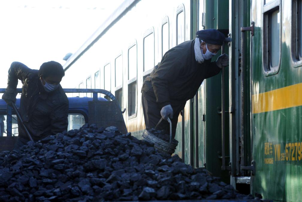2011年2月6日,北京客运段保洁人员在为新增春运临客列车上煤。