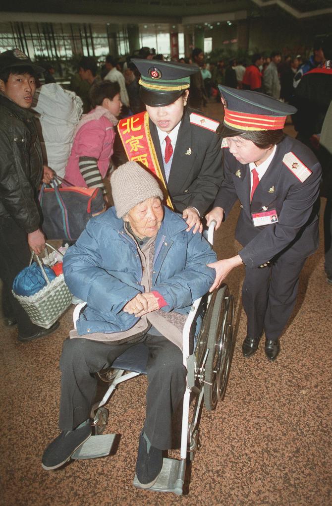 1998年1月8日, 北京西客站采取增加日勤售票人员、组织义务服务小分队等措施,全力以赴搞好春运。这是工作人员送行走不便的旅客王桂英上车。