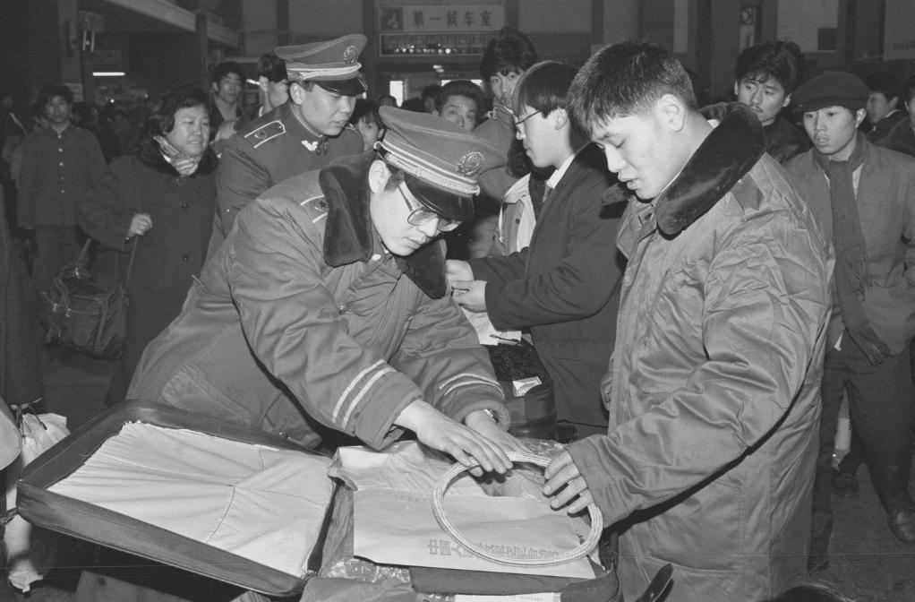 北京火车站进入春运高峰后,北京铁路公安处民警一天24小时对上车旅客的旅行包实行严格检查,以防易燃、易爆、危险品被带上车,确保旅客生命财产的安全 (1993年1月14日发)。