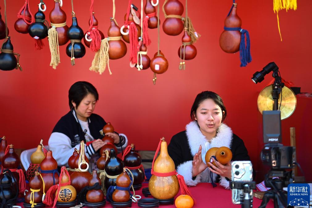 2024年1月8日,传统酒葫芦工艺匠人在陕西西安大唐芙蓉园内的非遗年货集市上直播带货。新华社记者 邹竞一 摄
