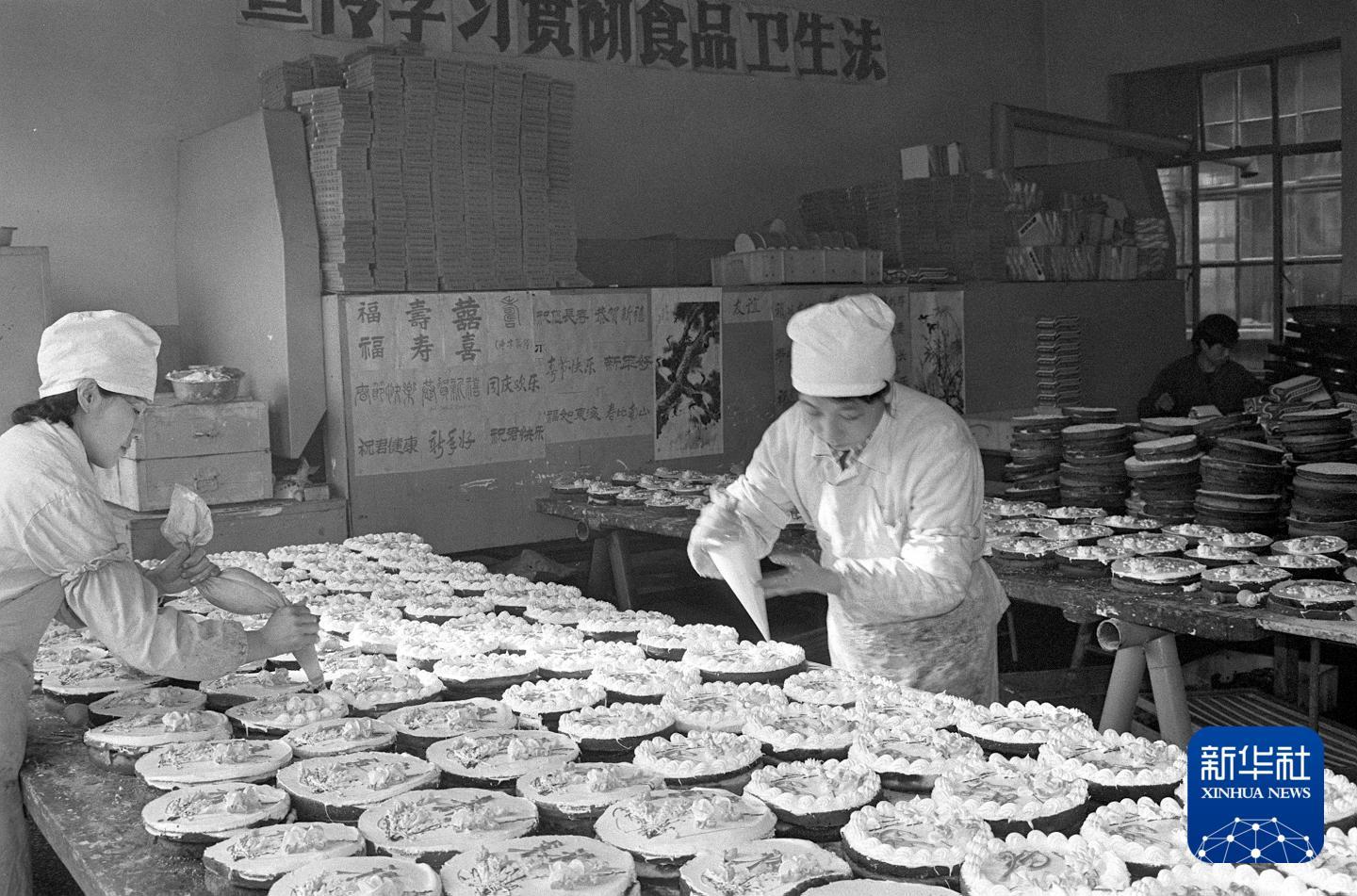 1984年春节前夕,北京市一家糕点车间工人正在制作奶油蛋糕。 新华社记者 袁汝逊 摄