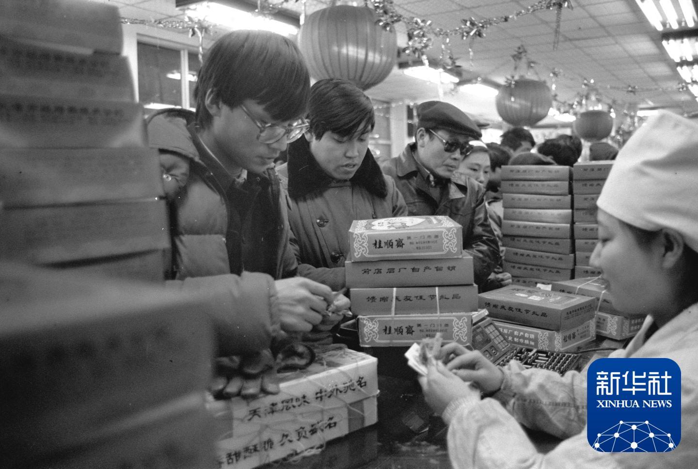 1990年天津年货市场上,顾客们购买桂顺斋的糕点,用于节日馈赠亲朋好友。新华社记者 曾志坚 摄