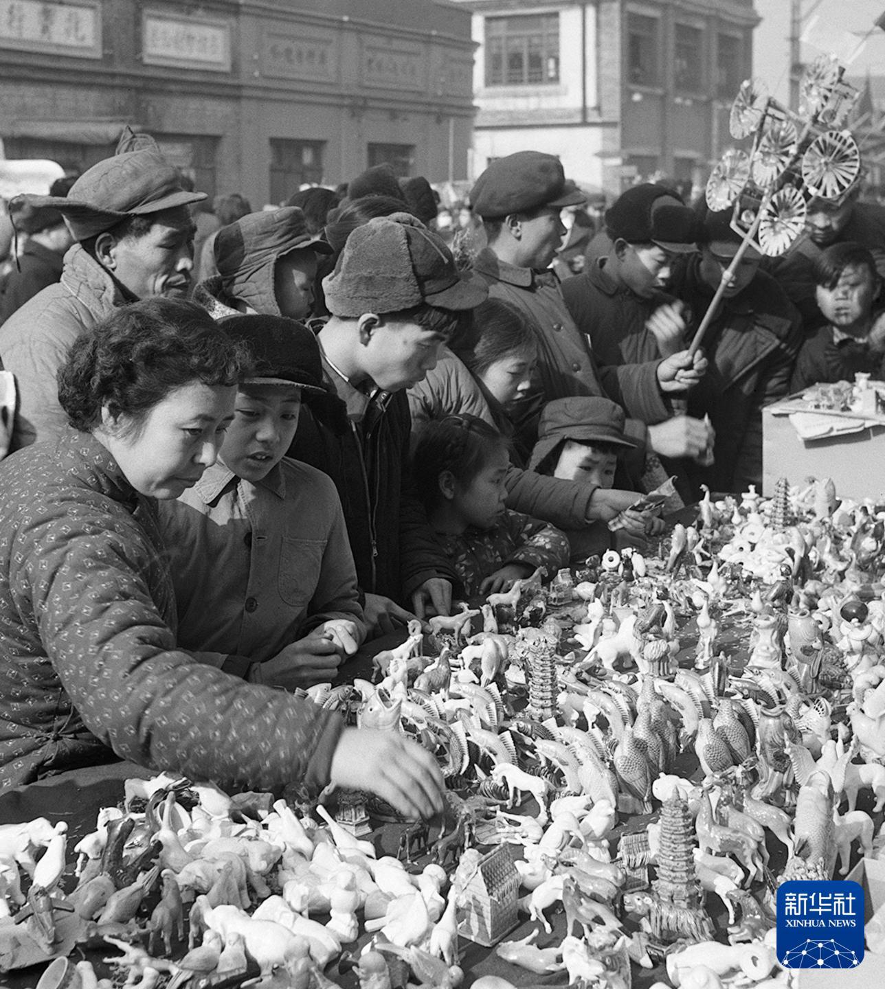 1960年,人们在北京厂甸春节市场选购玩具。 新华社记者 楚英 摄
