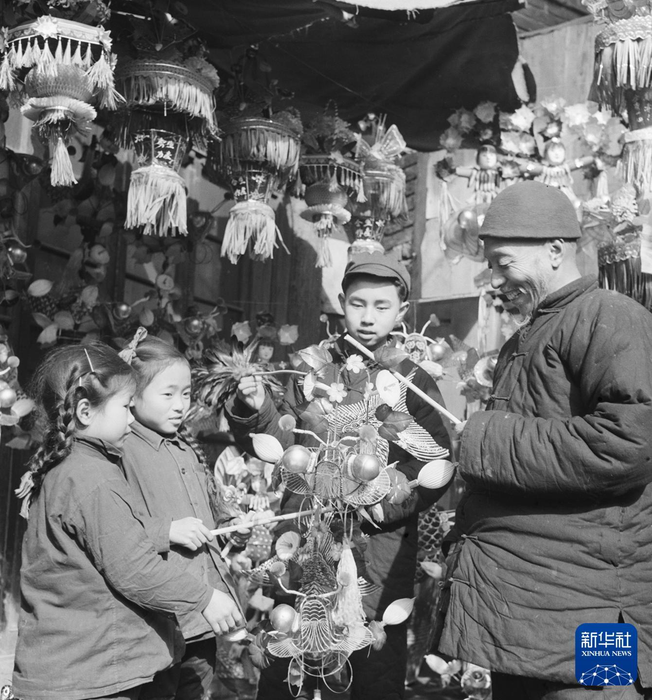 1956年春节前夕,天津一位顾客(右一)给他的两个小孙女挑选花灯。 新华社记者 胥志成 摄