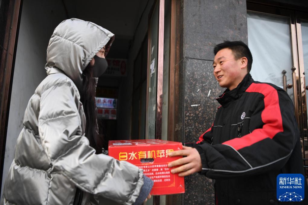2019年2月3日,在陕西西安,一名快递员(右)将快递送至客户手中。春节将至,人在归途,一箱箱年货也在快递小哥的车厢中奔向目的地。新华社记者 张博文 摄