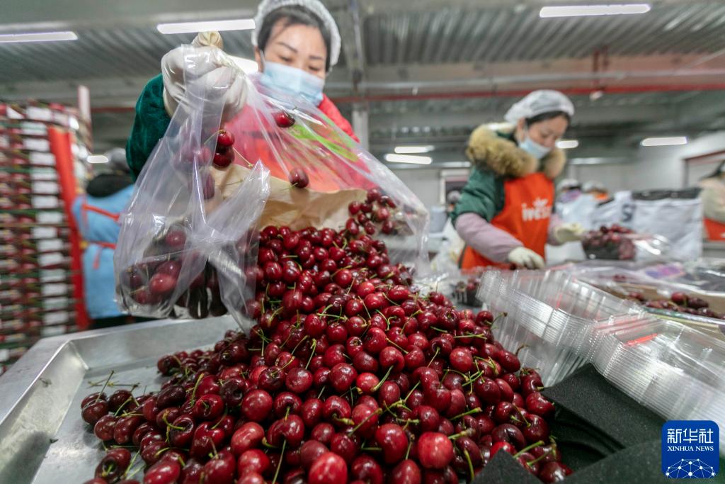 2021年1月21日,工作人员在上海市郊一家进口水果综合加工包装中心分拣车厘子。这些来自智利的新晋年货将通过线上线下平台进入千家万户。新华社记者 王翔 摄