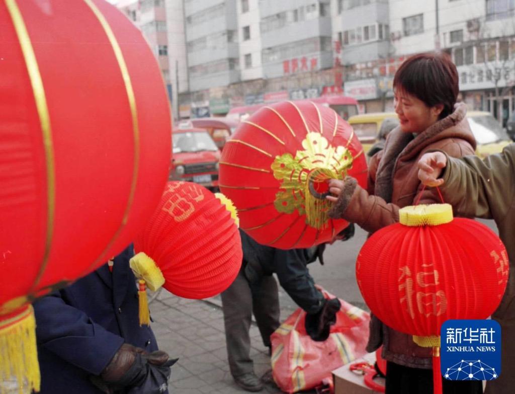 2000年春节前夕,市民在宁夏银川南环路一家摊点上选购红灯笼。 新华社记者 刘泉龙 摄