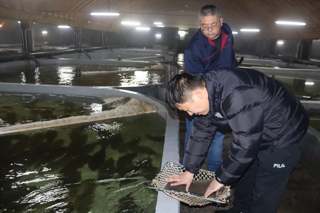 孙学亮(右)与企业人员共同检查鱼类生长情况。新华社记者 郭方达 摄