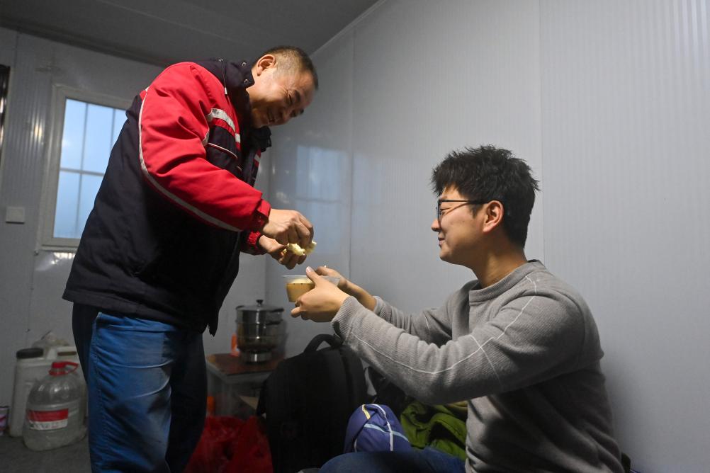 观冰哨内,李均平(左)为杨啸(右)掰开馒头泡进汤里(1月24日摄)。新华社记者杨晨光 摄