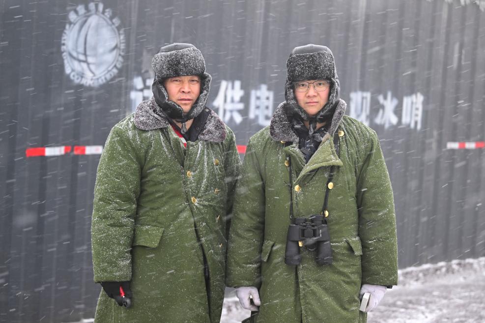 杨啸(右)和搭档李均平在观冰哨前合影(1月24日摄)。新华社记者杨晨光 摄