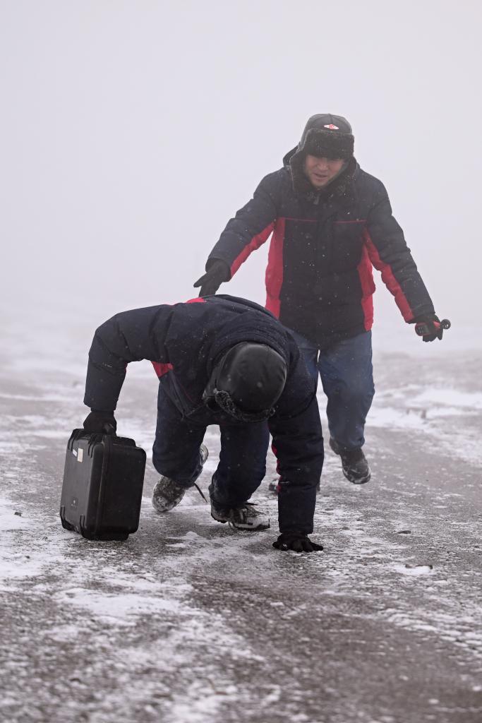 杨啸(左)和搭档李均平在夜间观测风速(1月23日摄)。新华社记者杨晨光 摄