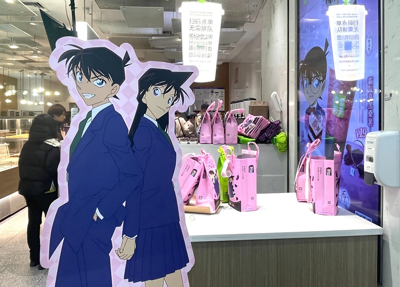某奶茶店展示的《名侦探柯南》联名人形立牌及饮品。新华网记者 吴寒冰 摄
