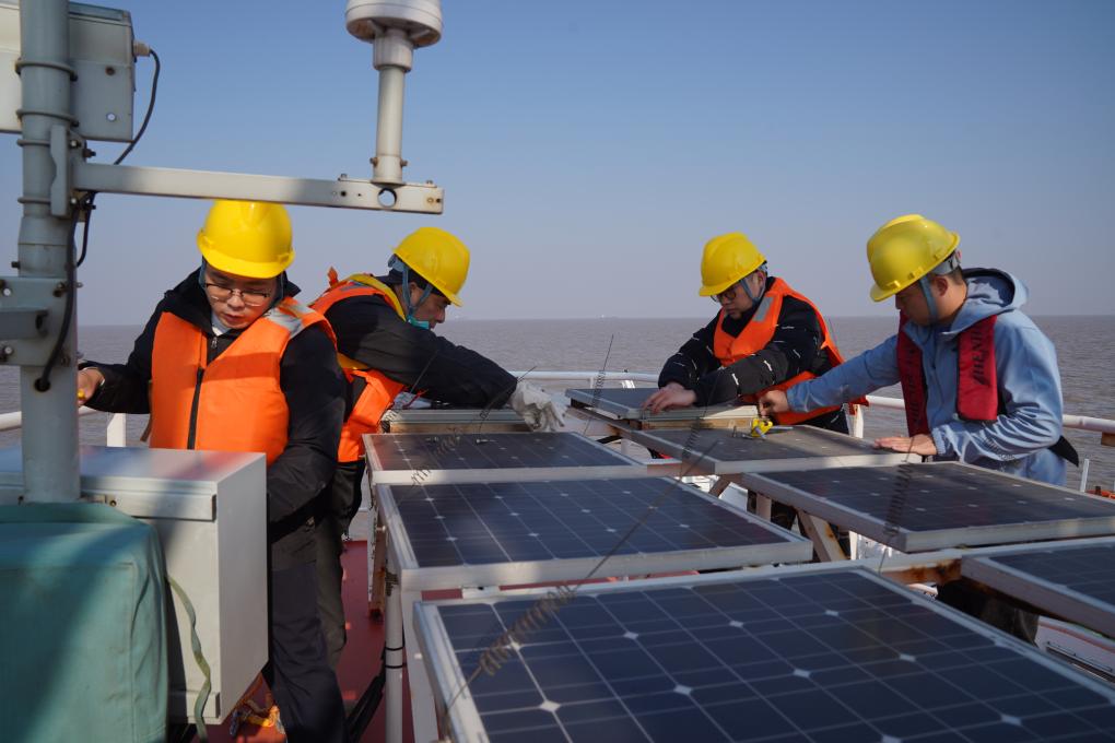 在灯船上拆光伏板和自动气象站。新华社记者 周杉 摄