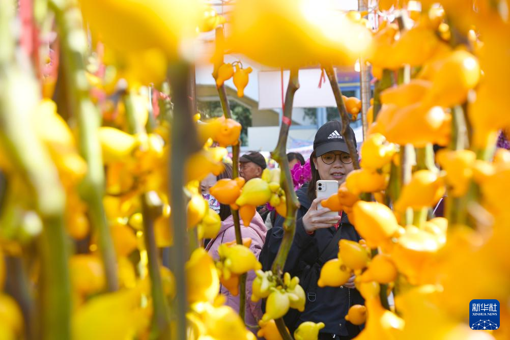 家住湾仔的蒋慧娴和丈夫提着刚采购的一盆蝴蝶兰,正在询问隔壁摊位售卖的黄金果的价格。“黄金果造型别致,寓意五代同堂,用来做福桶装点门户,家里的老人点名要买。”她说。